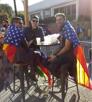 By 1pm, a bus with a DJ booth got hundreds, then more than 1,000 celebrants -all wearing facemasks- dancing on Castro Street as others enjoyed food and drinks at outdoor parklets outside bars and restaurants. In between music, celebrants listened to impassioned speeches by Sister Roma, Alex U Inn and others. They also listened to a live audio feed of both Biden and Harris' speeches from the rally in Wilmington, Delaware.